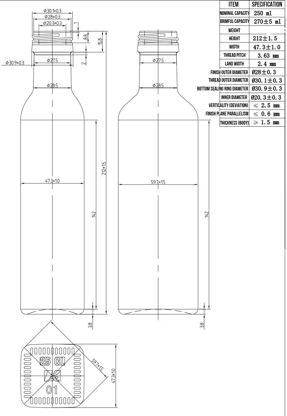 فوهة الزجاجة مُجهزة بتقنية الطحن الدقيق CNC، ويتم التحكم في تفاوت الخيط عند ±0.05 مم لضمان إحكام إغلاق الختم. يمكن تجميد الزجاجة ثلاث مرات، مع قيمة ضبابية تصل إلى 89%، مع الحفاظ على نافذة شفافة جزئيًا لعرض العلامة التجارية.